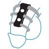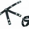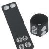 3 different sized metal rings. One base ring measures 2 inches, one shaft ring measures 1.5 inches and the tip ring measures 1.25 inches. Metal cock rings are connected with a black strap and two metal brads.