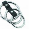 3 different sized metal rings. One base ring measures 2 inches, one shaft ring measures 1.5 inches and the tip ring measures 1.25 inches. Metal cock rings are connected with a black strap and two metal brads.