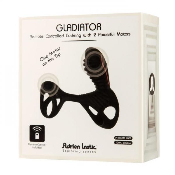 Adrien Lastic exploring senses. Gladiator Remote Control Cock Ring with 2 powerful motors is made using latex free, phthalate free 100% super soft silicone. Color Black. 10 speeds. 1 motor. Integrated battery and charger. 4.3 inches with 1.4 inches in diameter. USB rechargeable. USB charging cord included. 2 year warranty.