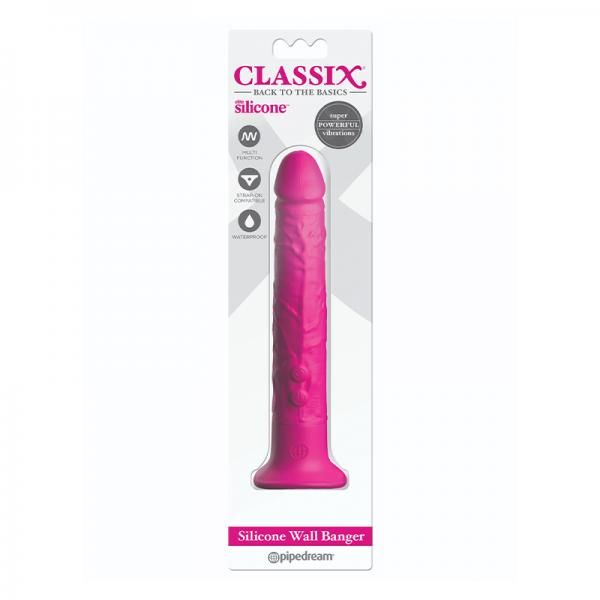 KEY PRODUCT FEATURES Indulge yourself with the simple pleasures of a classic! With ten vibrating functions, a powerful suction-cup base, and a sturdy realistic design, there`s a lot to love about this Classix Silicone Wall Banger! The lower button turns on the strong motor and the upper button cycles through ten intense pleasure functions, while the incredible grip of the suction-cup base holds the dildo securely in place, providing thrilling stimulation right where you want it. Stick the dildo to the floor, wall, bedpost, or almost any flat surface to enjoy wall-bangin` satisfaction with each passionate thrust. And the Classix Silicone Wall Banger is conveniently waterproof – Try it in the spa or shower and turn bath time into pleasure time!ADDITIONAL PRODUCT FEATURES90 Day Limited Warranty, Suction Cup BasePACKAGE CONTENTS(1) 7.5 Wall Banger 2.0