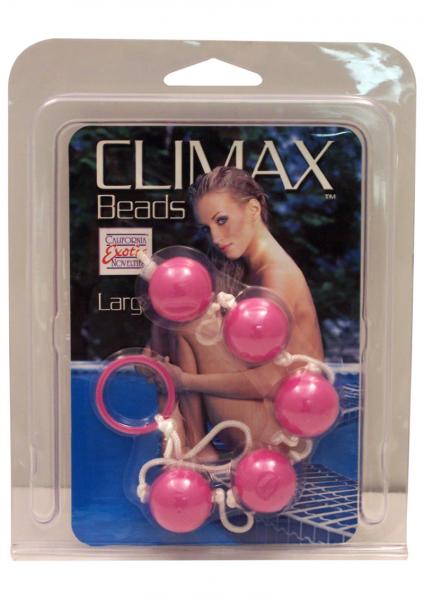 Climax Beads Large pleasure plastic can be used as anal or vaginal sex toys. Beads come on a nylon string. Assorted colors. Safe and pure for body and pleasures. Made using phthalate free, non-toxic materials ABS plastic with nylon cord. Large climax beads measure .9 inch in diameter. Ring on the end makes using non-vibrating climax beads easy to enjoy then remove safely. Bulk weight 1.0 ounce. Always clean before and after use plus between partners. Category: For Women, Bullets, Beads & Balls, Beads. Climax Beads is a registered trademark for California Exotic Novelties. Sex toys and sexual wellness.