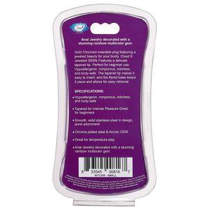 Cloud 9 Gems Gold Anal Plug Small. Anal Jewelry decorated with a stunning rainbow multicolor gem. Gold Chromed wearable stainless steel plug featuring a jeweled beauty for your booty. Cloud 9 Jeweled Gems Features a delicate tapered tip. Perfect for beginner use. Hypoallergenic, nonporous, odorless, and body safe. The tapered tip makes it easy to insert, and the flared base keeps it place and allows for easy retrieval. The sparkling jewel makes playtime fun. This Cloud 9 Jeweled Anal Plug is excellent for temperature play when you prepare it in hot or cold water. This Cloud 9 Gem anal plug is both visually stunning and ideal for stimulating anal play.