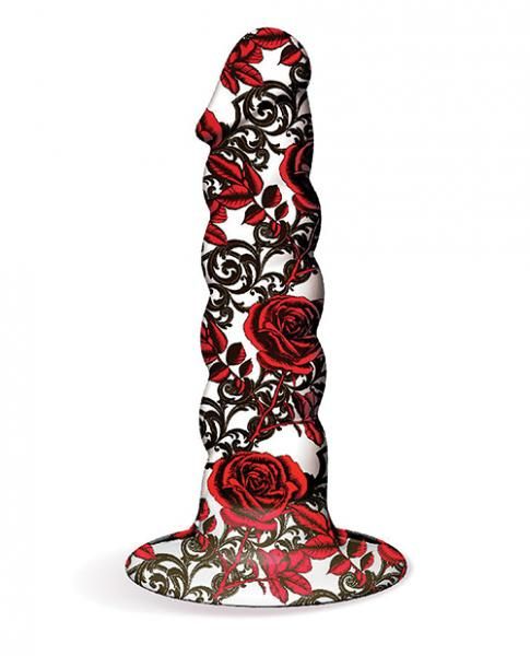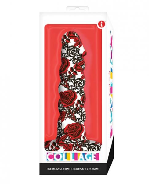 Collage Iron Rose Dildo from Icon Brands. Premium silicone adult toys, with beautiful, body safe coloring. Each piece is hand crafted for your unique pleasure. Eye popping designs tattooed right onto the silicone. Soft and silky and just the right size, they are colorful, whimsical, elegant and stunning. Each features and ultra grip suction cup which also makes them harness compatible. They quickly warm to your touch, are non-porous and easy to clean. Water based lubricant. Gentle Soap and water to clean only, never an alcohol based soap. Size 7 inches in total length by 3.7 inches in width.