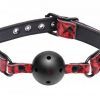 This perforated gag lets you restrict the speech of your plaything while still allowing them to breathe easily. The smooth plastic is tasteless and odorless, and large enough to gag them without being uncomfortable. The sexy embossed outer design is lined with soft, padded neoprene and is accented with black, nickel free hardware. The strap is fully adjustable, and closes with a rolling buckle. Measurements: Adjusts from 15 to 22 inches around, ball measures 1.85 inches in diameter. Material: Vinyl, plastic, neoprene. Color: Red
