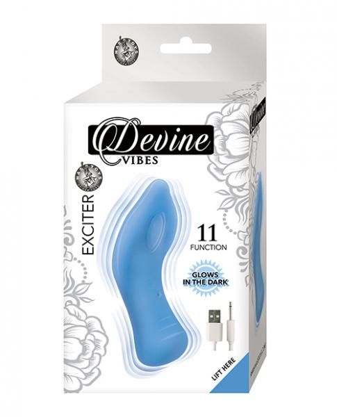 Devine Vibes Exciter Glow In The Dark Clitoral Teaser from Nasstoys of New York. 11 functions. Glows in the dark. Clitoral teaser. Body safe silicone. RoHS compliant. Phthalates free. Waterproof vibrations. Materials 100% silicone. Size length 4 inches. Rechargeable. Charging time 60 minutes. Working time 60 minutes.