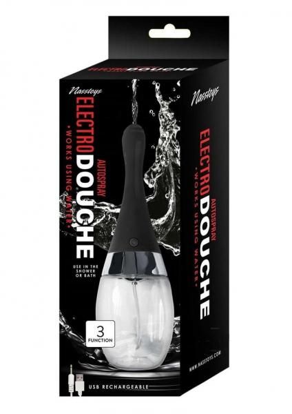 Douching had never been easier with the Nasstoys Electro Douche! andnbsp;Simply fill the bulb with water, firmly twist on the auto-spray nozzle, comfortably using water-based lubricant, then press and hold the power button to begin douching. No more squeezing a bulb and no more back flow! andnbsp;The user may refill the bulb and repeat the douching process as needed. andnbsp;Please clean before and after each use with toy cleaner. To charge, please the pin charger into the back of the douche nozzle. 3 different water jet settingsUse in the shower or bathRoHS compliantPhthalates freeWaterproofMaterials: Silicone, PET andamp; ABSSize: Length – 10, Width – 3Rechargeable: Charging Time – 1 hour, Working Time – 1 hour, Voltage – 3.7V