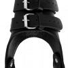 Measurements: Fits heads between 19 inches and 26 inches in circumference, 4 inches in width. Materials Leather, metal. Color Black. Note locks sold separately.