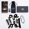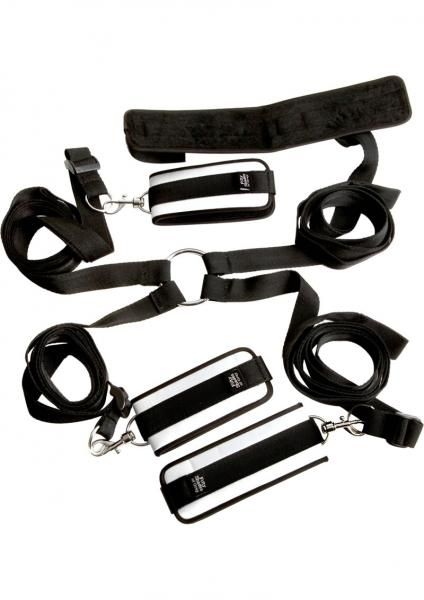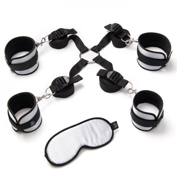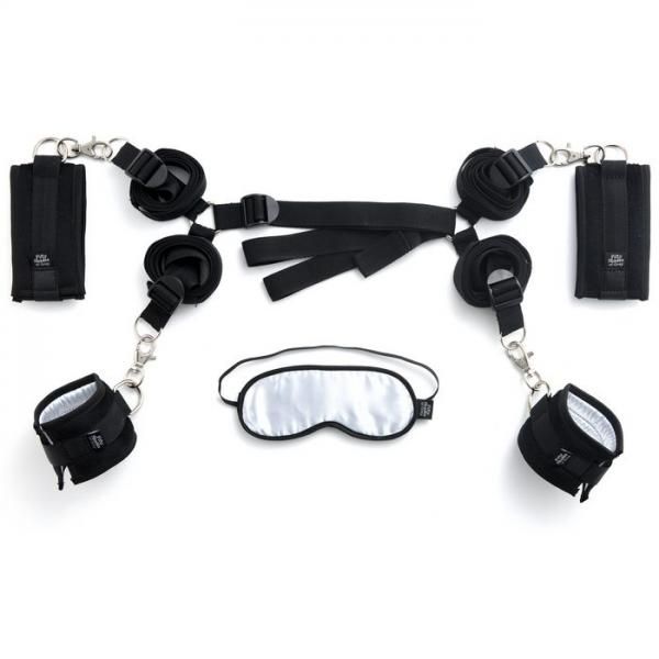 Restrain your lust with this soft, strong and secure bondage kit. Ideal for anyone wishing to recreate Christian and Ana`s passion in their own bedroom, take charge and indulge your lover in full body restraint as part of your bedroom bondage repertoire. Soft cuffs fasten around your wrists and ankles with easy-to-use velcro straps, making full body restraint easy to achieve. Use the incorporated swivel clips to fasten your lover`s wrists or ankles together and allow them to focus on their pleasure, or connect the cuffs to the included bed straps to limit their movements further.The fully adjustable bed straps can be placed beneath the mattress to transform your bed into a bondage haven without the need for specialist equipment or a bed frame. Once in place, 4 straps topped with metal O-rings protrude from each corner of the bed, allowing you to quickly and easily clip the cuffs in place.Suitable for use with any sized mattress, the bed restraints measure 49 inches long, with 2 x 98 inch widths across each end to attach to the cuffs. Fully adjustable using the sturdy buckles, the versatile bondage kit also folds up into a satin storage bag for easy transport.A luxury satin blindfold is also included to further increase your lover`s pleasure – just slip the soft eye mask over their eyes to enhance their anticipation of each touch.Cuff length 9.50″Cuff width 2.75″