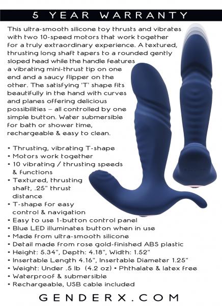 Gender X True Blue Vibrator for stimulating prostate from Evolved Novelties. This ultra smooth Silicone adult toy thrusts and vibrates with two 10 speed motors that work together for a truly extraordinary experience. A textured, thrusting long shaft tapers to a rounded gently sloped head while the handle features a vibrating mini thrust tip on one end and a saucy flipper on the other. The satisfying T shape fits beautifully in the hand with curves and planes offering delicious possibilities. All controlled by one simple button. Water submersible for bath or shower time, rechargeable. Easy to clean. Features: thrusting, vibrating T-shape. 10 vibrating, thrusting speeds and functions. Motors work together. Textured, thrusting shaft, .25 inch thrust distance. T-shape for easy control and navigation. Easy to use. 1 button control panel. Blue Light Emitting Diode LED illuminates button when in use. Made from ultra smooth Silicone. Detail made from rose gold finished ABS Plastic. Size height 5.34 inches, depth 4.18 inches width 1.52 inches. Insertable length 4.16 inches, insertable diameter 1.25 inches. Bulk weight 4.2 ounces. Phthalate free and latex free. Waterproof vibrations and submersible for bath tub play. Rechargeable, USB cable included. Categories: Prostate Massagers, P-Spot Stimulators, Prostate Massagers, Rechargeable Vibrators, Male P-Spot Stimulators. 2022.