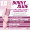Ever seen a bunny slide? This bunny does that and more! Enjoy 10 sliding modes that effortlessly slip inside of you, stimulating you within and add in another 10 vibration modes to tease, tantalize and give you a delicious buzz! Made of premium silicone, this bunny vibrator is phthalate-free and body-safe. Enjoy the plush, silky smooth surface with water-based lubricants! The shaft has a G-spot stimulating bulb that stimulates and massages you with each slide of the shaft! The two-pronged rabbit ears are also made of plush, silky silicone that will tickle your clit with pleasure-filled vibes while the shaft vibes deep within you! Take the vibe into the shower! The IPX6 waterproof rating allows the toy to handle strong water jets. Between uses, recharge with the USB cable provided. Wash the toy with warm water and soap, then spray with a toy cleaner before wiping or patting dry with a soft cloth and storing in a cool, dry place. Give yourself the gift of a slippery bunny by grabbing your lube and letting it slide inside! Enjoy the sliding function that has a gentle thrust as the clit-tickling rabbit ears stimulate your clit without you even having to move your hand or hips! Indulge in 10 sliding and 10 vibrating modes that buzz and slide for your personal satisfaction. Give into sweet pleasure after a long, stressful day and unwind with this delightful vibrating rabbit toy! Measurements: Overall length: 10.2 inches, Insertable length: 6 inches, Widest able diameter: 1.5 inches Materials: Silicone, ABS plastic Color: Light Pink Note: Made with a waterproof rating of IPX6; do not submerge. Use only water-based lubricants. Key Features: Sliding and Vibrating Features: Enjoy 10 sliding and vibrating modes that enhance your penetrative experience! Clit Stimulating Rabbit Ears: Enjoy the vibrations as they buzz through the silicone rabbit ears resting on your clit! Premium Silicone: Enjoy the silky, plush, premium silicone. It is completely phthalate-free and body-safe! Rechargeable and Waterproof: Recharge using the USB cable provided. Enjoy high powered jet streams and water play in the shower, but do not submerge.
