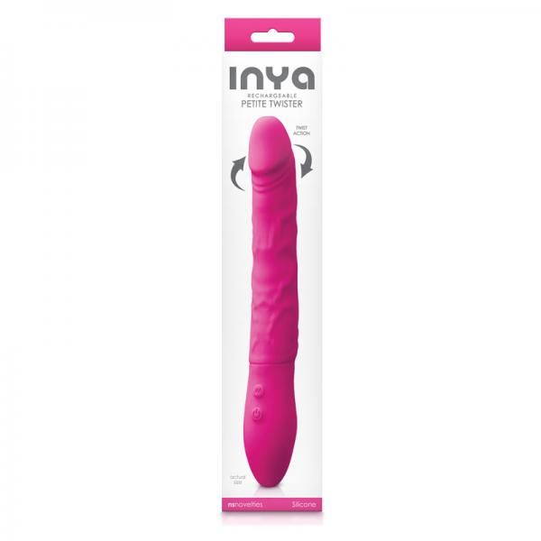 Twister Petite by INYA. A rotating and vibrating, rechargeable silicone massager with adjustable shaft. Seven settings for tailor made excitement. Safe with all lubricants. water resistant. Product Dimensions: 9.09 x 1.42 x 1.42 in. Package Dimensions: 12.2 x 2.56 x 1.77 in.