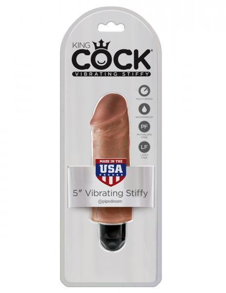 King Cock 5 inches Vibrating Stiffy Tan Vibrator Sleeve. When you are looking for a realistic vibe that is always ready for action, the King Cock Vibrating Stiffy is the perfect choice for maximum satisfaction! This life like dildo is made in America and features a powerful multi-speed vibrator that delivers mind blowing thrills. It is body safe. Feels even better than the real thing! Try it in the shower or spa and turn bath time into pleasure time. Waterproof for play in and out of the water. Vibrator requires 1 AA battery, not included. Made using body safe materials PVC realistic sleeve, ABS plastic traditional vibrator. Made in the USA.