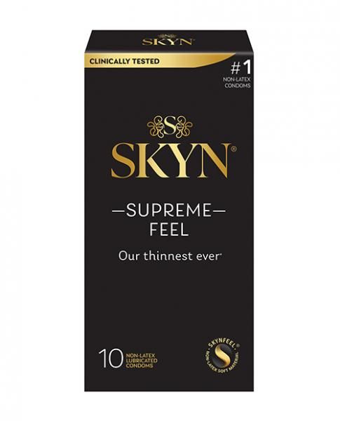 Upgrade to the new era of SKYN condoms with SKYN SUPREME FEEL and experience the ultimate comfort and natural fit. Made from our revolutionary SKYNFEEL material, these premium, polyisoprene lubricated condoms are our thinnest ever, and provide supreme sensitivity and skin-on-skin feeling with a long-lasting, ultra-smooth lubricant. They are non-latex, making them a great choice for anyone with latex allergies or sensitivities, and don’t have a rubber latex smell. SKYN’s SUPREME FEEL non-latex condoms are as strong as premium latex, tested to the highest safety standards of safety and reliability and are safe to use with water-based lube and silicone lube.  SKYN FEEL EVERYTHING.