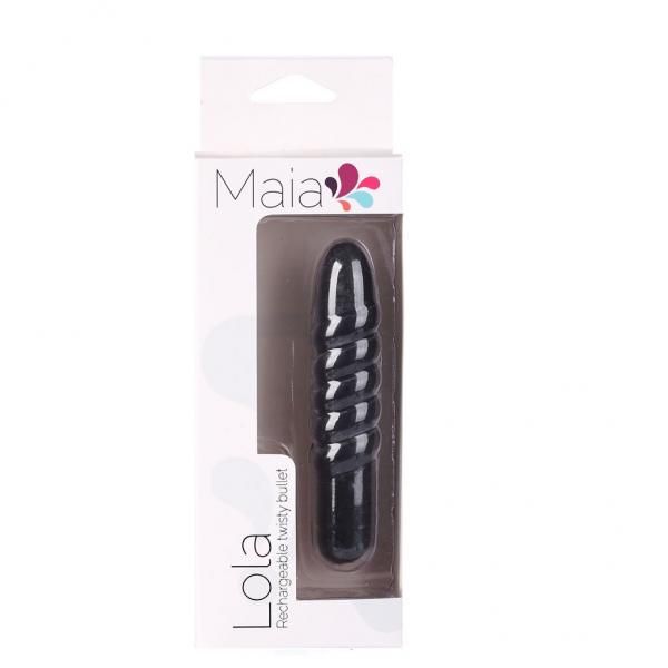 Lola Rechargeable Twisty Bullet Vibrator Black from Maia Toys. 10 function super charged vibrating bullet with a twisty design for maximum sensations. Lola Vibrator is small enough to carry with you but is powerful to super charge your day or night. Lola Vibrator is coated with 100% medical grade Silicone for body safe use and is easily cleaned with mild soap and water or adult cleaners. Lola is submersible for use in the bath or shower. Lola Bullet Vibrator features: 10 speeds of pulsating vibrations. Strong motor. Silicone coating. USB Rechargeable. Waterproof vibrations and submersible.USB cable included. Size 4.5 inches by .8 inch. 1 year warranty.