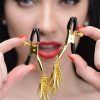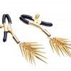 Lure Adjustable Nipple Clamps With Gold Spikes. These nipple clamps are accented with gold spikes for an exotic look and feel. The black coated rubber tips add to the exotic look and provide a comfortable grip. The gold easy to use screws leave adjusting the pressure, literally at your fingertips, to create relentless pleasure and pain. Measures 4 inches long, clamps open up to 0.5 inch.