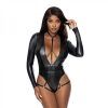 From the Exposed by Magic Silk collection, this style includes: a longsleeve low V-neck teddy, and a matching harness that wraps around the hips and thighs, with swan-hook closure at the neck and silver-tone O-rings.