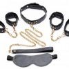 Includes: Blindfold, wrist cuffs, ankle cuffs, and collar with leash