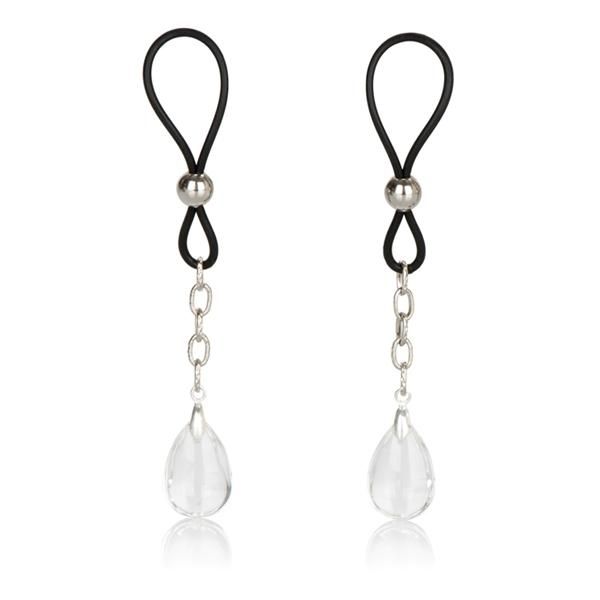 Includes 2 fully adjustable nipple adornments. Soft and comfortable cinch design. Non-piercing, non-tarnishing, nickel free. Nickel free iron chain, beads, Silicone loops, Crystal jewel. Size 2.25 inches each nipple loop. 4.5 inches overall length.