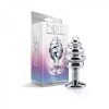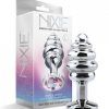 Nixie Ribbed Metal Butt Plug. Rainbow Jewel. Smooth threaded tapered shape. Rounded tip for easy insertion. Comfortable plug stays in place. Flared base for easy retrieval. Easily warmed or cooled. Embedded Rainbow Jewel Base. Storage bag included. Nickel free Aluminum Alloy. Body safe and Phthalate free.