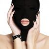 Ouch Subversion Mask Black. Keep your submissive incognito with this 3 Hole Hood Mask. This comfortable open mouth and eyes hood is designed to stretch completely over the head and closes easily at the back with a zipper. The lightweight fabric makes breathing and hearing a snap and best of all, your subject can still see and you still have access to their mouth!