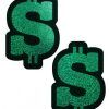 Money: Gold Glitter Dollar Sign Nipple Pasties by Pastease® are hand-made in the USA of soft form-fitting glittery material that forms seamlessly to curves and resists wrinkling over hardening nipples.