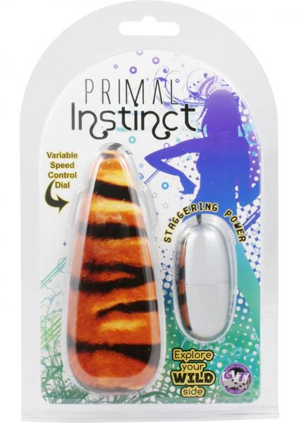 Explore your wild side! Primal Instincts series of bullet vibrators. Traditional silver bullet vibrator comes with an attached fun tiger print power supply. Feeling animalistic? Explore your wild side with Primal Instinct. Featuring a variable speed control and a staggeringly powerful bullet, you can’t help but go wild. Vibrating Bullet measures 2 inches long by 1 inch wide. Bulk weight 2.5 ounces. Vibrating sex toy requires 2 AA batteries, not included. Bullet vibrator is made using phthalate free, non-toxic materials ABS plastic. Variable speed power of vibrations. Staggering power. Primal Instincts Tiger Bullet Vibrator from Golden Triangle Novelties. GT Adult Toys For Everyone.