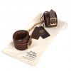 Handcrafted padded leather ankle cuffs with brass hardware. D-ring on each cuff for versatile bondage play. Detachable chain with swivel lobster clasp at each end. Compatible with the spreader bar and hog tie. Versatile for a variety of restraint positions. Embossed leather collection tag. Supplied in a branded drawstring storage bag.