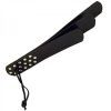 Riding crop with a feathered leather strips and rounded wooden handle. Color Black.