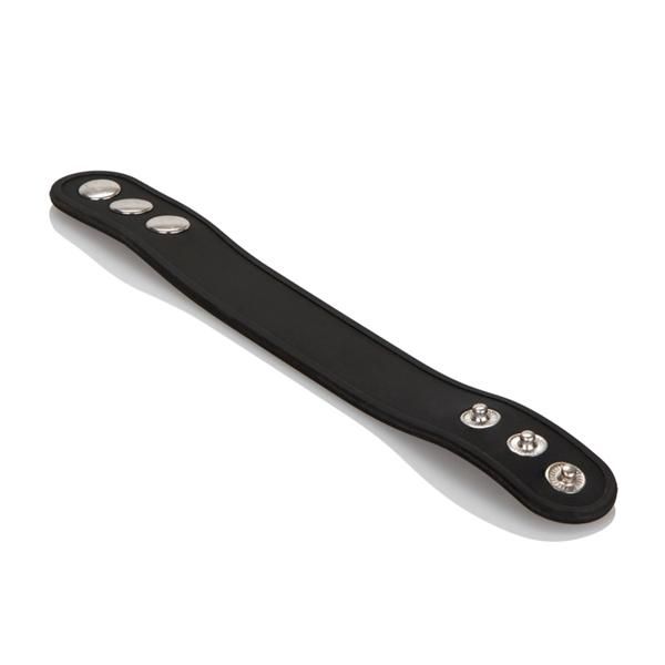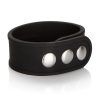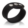 Silicone Tri Snap Erection Ring Black from California Exotic Novelties. Bulk weight 0.6 ounce. 9 inches by .75 inch. Stretchy and comfortable Silicone erection enhancer. Soft and smooth, thick and durable Silicone. Fully adjustable, three snap design. Heavy duty, nickel free hardware. Materials: Silicone enhancer ring, Nickel free Iron rivets, snaps.