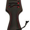 The compact size of this severe spanking paddle belies the amount of punishment in store for any filthy subject naughty enough to earn its sting. Put them in their place and let them know what you really think of them the word Slut is emblazoned on the front in deep red suede. The paddle has a firm, inflexible core sewn between two pieces of black leather with red thread. Do some serious damage to both their hide and their pride with this premium spanking paddle.