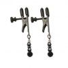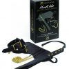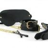 Explore the world of pleasurable pain with the Spartacus Little Black Box set. The set includes a blindfold, whip, nipple clamps, and cuffs. All the pieces have gold metal accents. Let the comfortable fit blindfold enhance your next sensual experience by cutting off the distractions of light and color and awaken your other senses. The tweezer clamps can be set to have a gentle or moderate hold depending on where you move the spacer ring. Give or receive a slap from the whip that hurts so good. Adjust the cuffs for a comfortable fit. This set is excellent for beginners and experienced alike.