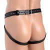 Keep your slaves cock confined in this evil leather jockstrap! Lock him into the luxurious leather straps to put him through a special kind of hell! The interior of the front panel is lined with hundreds of tiny, sharp spikes that will dig into your playthings delicate genitals. A zipper allows you to access his tormented flesh and permit him to urinate, but you can also secure the hole of the zipper to the peg above it with a lock, keeping him trapped in chastity until you decide to show mercy. All straps secure with attractive locking buckles, adjusting for a wide range of body types.