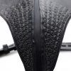 Measurements waist strap adjusts from 36.5 inches to 49.5 inches in circumference. Leg straps adjust from 24 inches to 33 inches in circumference. Materials Leather, metal. Color Black. Note locks not included. Warning: this is a NEW item that is not in retail packaging, usually a plain box, wrapped in plastic or a poly bag.