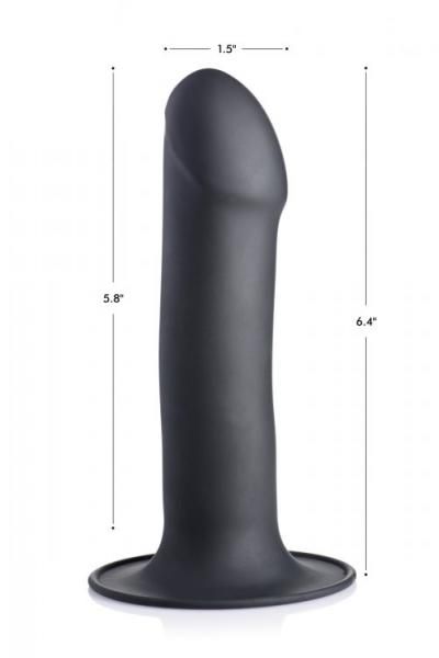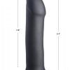 Measurements 6.75 inches in total length, 6 inches insertable length, 1.5 inches at widest diameter, 1.35 inches at narrowest diameter, unmanipulated. Material Silexpan silicone. Color Black.