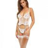 Lace teddy features a deep V-neckline with scalloped trim halter straps sheer bodice open back with multiple adjustable straps high cut sides and a thong cut back. Ladies sizes medium to large, M/L. Bust 34 inches to 38 inches. Waist 26 inches to 30 inches. Hips 36 inches to 40 inches. Cups B/C. Dress sizes 10 and 12.