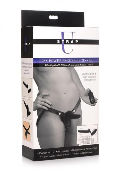 Enjoy penetrating your partner and being penetrated at the same time! With this pegging harness, you can enjoy the feeling of being filled as you give that sensation to your partner, as well. As a bonus, you can both enjoy 4 speeds and 7 patterns of vibration. Control it hands-free with the remote control that controls each dildo. The dildos are detachable from the PU leather harness and made of premium grade, phthalate-free silicone that is body-safe for worry-free fun! Make sure to only use water-based lubricant for best results. The harness can be adjusted around your waist and thighs for a comfortable fit. After use, recharge the vibrating dildos with a USB charger and hand wash the silicone with warm water and antibacterial soap and a toy cleaner. Dry with a soft cloth and store in a cool, dark place out of direct sunlight and separate from other toys. Remote control requires 1xCR2032 battery (included). Measurements: LARGE DILDO able length: 5.5 inches, widest able width: 1.3 inches SMALL DILDO able length: 3.2 inches, widest able width: 1.4 inches Harness adjusts up to 48 inches waist circumference Thigh straps adjust from 13 inches to 26 inches in length Materials: Silicone, PU leather, ABS plastic Color: Black Key Features: Vibrating Dildos: Choose between 4 speeds and 7 patterns of vibe in dual motors for unique vibration in each. After use, recharge with included USB charger. Premium Silicone: Smooth, plush and phthalate-free silicone means it`s deliciously sensual and body safe. Adjustable Harness: Harness adjusts up to 48 inches for a comfortable fit. Remote Control: The remote control allows you to be hands-free as you play with yourself and a partner. The distance for the remote is 32ft; requires 1xCR2032 (included).