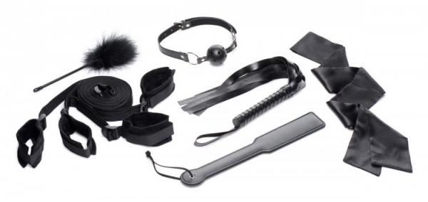 Strict Bed Restraint Bondage Kit from XR Brands. Everything you need for a fulfilling BDSM scene is included in this bondage kit! The under the mattress bed restraints holds your partners body open so you can punish and please their body with the included paddle, flogger, or tickler. Explore the world of bondage at your own pace and use each accesorry as you see fit! Edge into more extreme levels of BDSM play with the included breathable gag and comfortable blindfold, deny their sight to increase their other senses and gag their mouth to complete the classic bondage aesthetic. This all in one kit is built for beginners and experts alike to make bedroom bondage easy and accessible! Blindfold measurements 60 inches length, 3 inches width. Ball Gag measurements 25 inches length, adjusts from 15.5 inches to 23 inches, 1.8 inches ball diameter. Paddle measurements: 13.5 inches in length, 2 inches width. Flogger measurements 19.25 inches overall length, 13 inches tassel length. Feather Tickler measurements 10 inches length. Bed Restraints measurements: cuffs adjust from 5 inches to 12 inches in circumference, bed straps and connector strap adjusts up to approximately 48 inches in length. Materials PU Leather, Nylon, ABS Plastic, Satin, Metal, Feathers. Color Black. Key features: 6 Piece Bondage Kit. Everything you need for kinky bedroom bondage fun is included in this set: a Set of bed restraints, a blindfold, ball gag, paddle, flogger and tickler. Easy set up Bed Restraints: fits under most mattresses for an easy platform to base the rest of your BDSM fun! Each cuff can be adjusted for the perfect fit on most wrists and ankles. Versatile pleasure tools. The included flogger, tickler, and paddle can be used with or without the restraints so you can punish your lovers sweet spots with more freedom. Breathable Gag, Comfortable Blindfold. The included gag is comfortable and easy to breathe through, perfect for beginners and experts while you blind your partner to heighten their senses. Always have a stop word when things don’t go as expected. No video. 2022.
