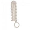 Soft, textured and stretchy penis extender adds girth plus 1 inch in length. Support ring secures fit.
