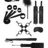 Ouch Supreme Bed Bindings Restraint Kit Black from Shoys Toys. Turn your bedroom into the ultimate bondage playground with the supreme under the bed bindings restraint kit. No special set up needed, just a mattress and your eager lover. Comes with 4 high quality tethers, breathable ball gag, plush leather hand cuffs and leg cuffs, satin eye mask, 12 inches bonded leather paddle, flogger, 11 inches feather tickler, hogtie connector and sex dice. Dimensions package 13.19 inches by 6.81 inches by 3.23 inches. Weight package32.63 ounces or 2.04 pounds.