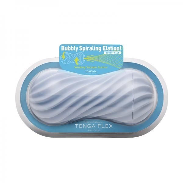 Tenga Flex Bubbly Blue male masturbators. The Tenga Flex spins, sucks and embraces with its unique spiral ribbed casing. There are two varieties to enjoy, each with different internal details and material strength! Gentle spiraling ribs embrace with delightful suction. Cover the air hole to create an internal vacuum! Using the item with the air hole covered also provides a brand new spiraling sensation! After use, remove the Elastomer Sleeve and wash with water. Pat dry after washing. The Elastomer Sleeve can be inverted for washing. Invert the Stand Cap to use as a drying stand. Place Elastomer Sleeve on the Stand Cap to air dry. Once dry, revert the Stand Cap to its original state and insert it into the Casing to store. Store in a cool, dry, dark place away from direct sunlight. Materials: Thermoplastic Elastomer TPE, Polypropylene PP. Lotion: Hole Lotion Real Red Ingredients: Water, Glycerin, Sodium Polyacrylate, Ethanol, Hydroxyethylcellulose, Phenoxyethanol, Methylparaben, EDTA-2Na, Polysorbate 80, Sorbitan Cocoate, Fragrance Size 3.1 inches in depth by 4.1 inches in width by 7.9 inches in height. by 3.1 inches in depth. Insertion length 6.10 inches. Insertion width 3.00 inches. Bulk weight approximately .80 pound. Other specifications: reusable, sample lubricant included. Categories: Male Masturbators, Sex Toys for Men, Solo Masturbators, Masturbation Sleeves. Video. Restricted, Amazon Restricted. 2023.