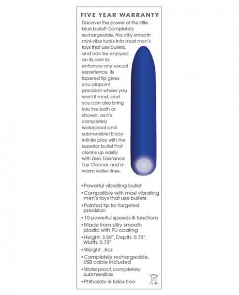 Discover the power of the little blue bullet! Completely rechargeable, this silky smooth mini vibe tucks into most men’s toys that use bullets and can be enjoyed on its own to enhance any sexual experience. Its tapered tip gives you pinpoint precision where you want it most, and you can also bring into the bath or shower, as it is completely waterproof and submersible! Enjoy infinite play with the superior bullet that cleans up easily with Zero Tolerance Toy Cleaner and a warm water rinse.