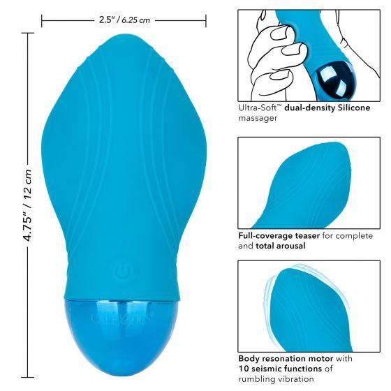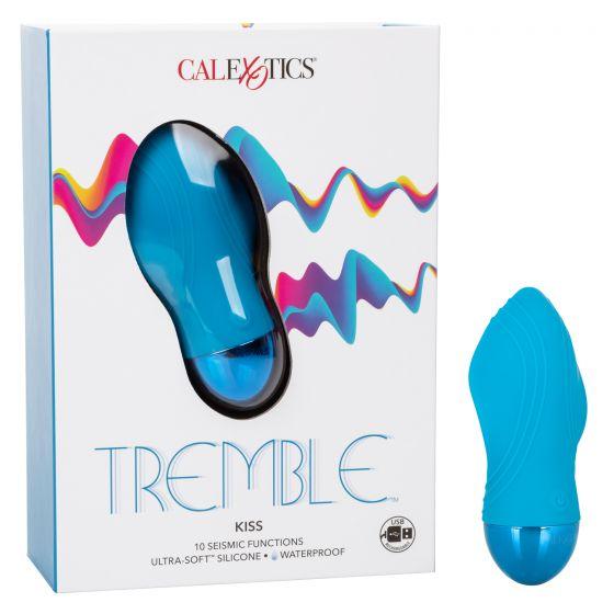 Feel the energy and put seismic pleasure in the palm of your hand. With rumbling vibrations and a full coverage body, the Tremble Kiss is made for total arousal. The body resonating motor, Ultra Soft dual density silicone and 10 functions of seismic vibration deliver earth shattering stimulation. Get playful while you flicker through 10 indulgent vibration, pulsation and escalation functions with the easy-touch control button. Effortlessly control pure pleasure with an easy touch silicone button and hold for 3 seconds to turn on or off. The Ultra Soft silicone and soft, flexible body are great for exploring sensual sweet spots and intimate pleasure points with ease. With a smooth shape and supple surface, you will be able to indulge in thrilling vibrations from any angle your desire. Get playful with up to 70 minutes of passionate pulsations with every charge. Charge up your passion in only 1.5 hour by plugging the provided USB cable into the self sealing charging port on the back of the massager. The slim massager discreet 5 inches size makes it the perfect travel companion, letting you embrace radiating pleasure wherever your fantasies take you. SKUSE440115. Color Blue. Materials Silicone, ABS Plastic, Metallic Plating. Power source USB Rechargeable, included. Features Phthalate Free, Waterproof, Vibrates. 1 year warranty. Maximum run time 70 minutes. Maximum charging time 90 minutes. Measurements 3.5 inches by 2.5 inches massager. 4.75 inches by 2.5 inches overall. Bulk weight 3 ounces. Package 14.9 ounces. Package 2.75 inches by 5.5 inches by 7.75 inches.