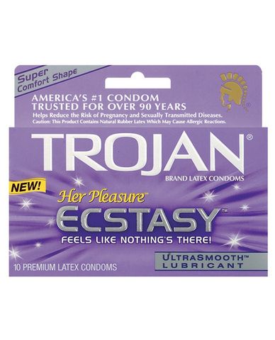 TROJAN® Her Pleasure™ ECSTASY™ condoms feature a revolutionary new design that let’s you feel the pleasure, not the condom! * Comfort shape allows freedom of movement for a more natural experience * Textured for female stimulation * Tapered at the base for a secure fit * UltraSmooth™ Premium Lubricant inside and out for a more natural feel * Made from Premium Quality Latex – to help reduce the risk * Each Condom is Electronically Tested – to help ensure reliability