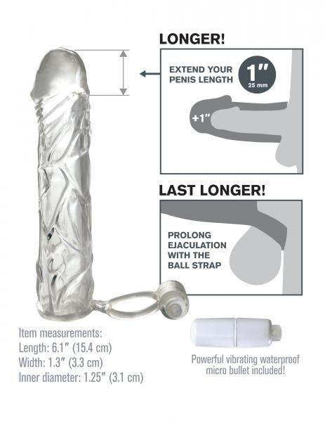 Cleanup is a snap after the fun with the included toy cleaner and warm water. One size fits most. This is extension not a condom. Features: 1 inch extension. Lifelike shape and feel. Powerful waterproof micro bullet. Phthalate free. Ball strap prolongs ejaculation and keeps extension in place. Includes free batteries, lube and sex toy cleaner. Item measurements: length 6.1 inches. Width 1.3 inches. Inner diameter 1.25 inches.