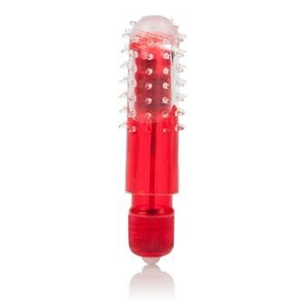 Travel with pleasure carrying this small massager. Comes with a removable sleeve that is phthalate free and hygienically superior. The sleeve is has raised nubs to tickle and tease you. Easy to use push button control. Waterproof for fun in or out of the water. Vibrator requires 2 AAA batteries, not included.