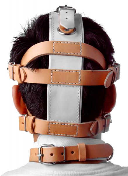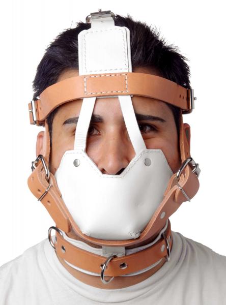 This hospital style muzzle is perfect for subduing your patient and restricting their jaw movement. The white and tan leather will set the perfect scene for your medical play. There are many points of adjustability for the ultimate in security and restraint. The muzzle consists of a series of straps that wrap around the head, as well as an attached collar. The inside of the muzzle is padded for comfort. There are 3 D-rings on the front of the collar, as well as one on the top, so you can tie your subject down, or attach additional accessories. The strap system helps keep the muzzle firmly pressed against their mouth, and keeps their jaw locked in place, for the ultimate in speech restriction. Measurements: Collar adjusts from 12 to 20 inches in circumference, forehead adjusts from 22 to 28 inches in circumference, jaw adjusts from 18 to 25 inches in circumference. Material: Leather, metal. Color: Tan and white Warning: This is a NEW item that is not in retail packaging, usually a plain box, wrapped in plastic or a poly bag.