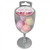 A set of sweet smelling wine scented bath bombs packaged in a wine glass. Immerse yourself in the experience by enjoying a glass of your favorite beverage with a dip in the tub. Choose from one of three intoxicating scents: Shiraz, Chardonnay, or Sangria. Includes 8 bath bombs that are 0.53 ounce each. The wine glass is made of plastic, so there is no need to worry about it breaking in or near the tub.